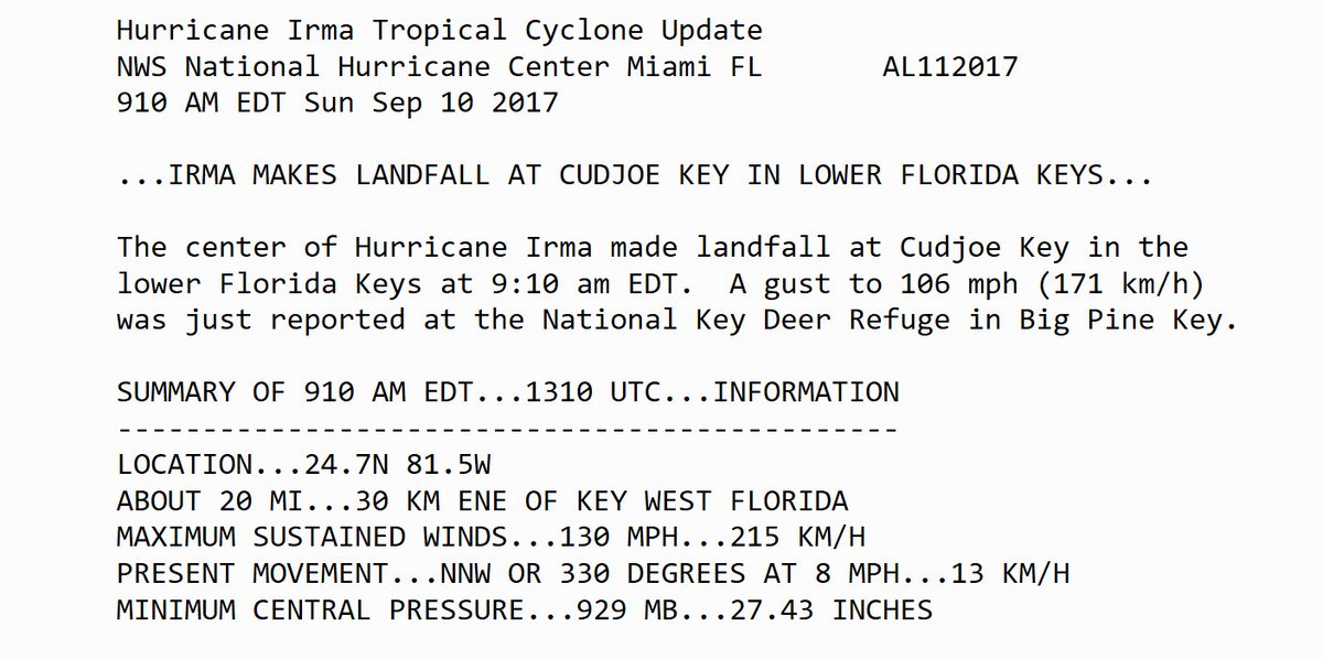 OFFICIAL: #Irma has made landfall on Cudjoe Key, FL. The first Category 4 hurricane in the Keys since Donna, on the same date, in 1960.