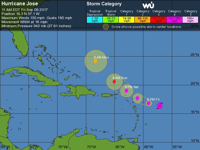Hurricane #Jose now a Category 4 with max sustained winds of 150 mph. Track takes it just north of Barubuda, St Martin & St Barts...