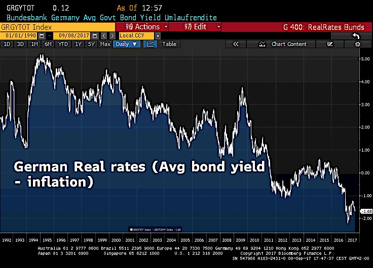 Financial repression in one chart: Since 2011, German savers see negative real interest rates.