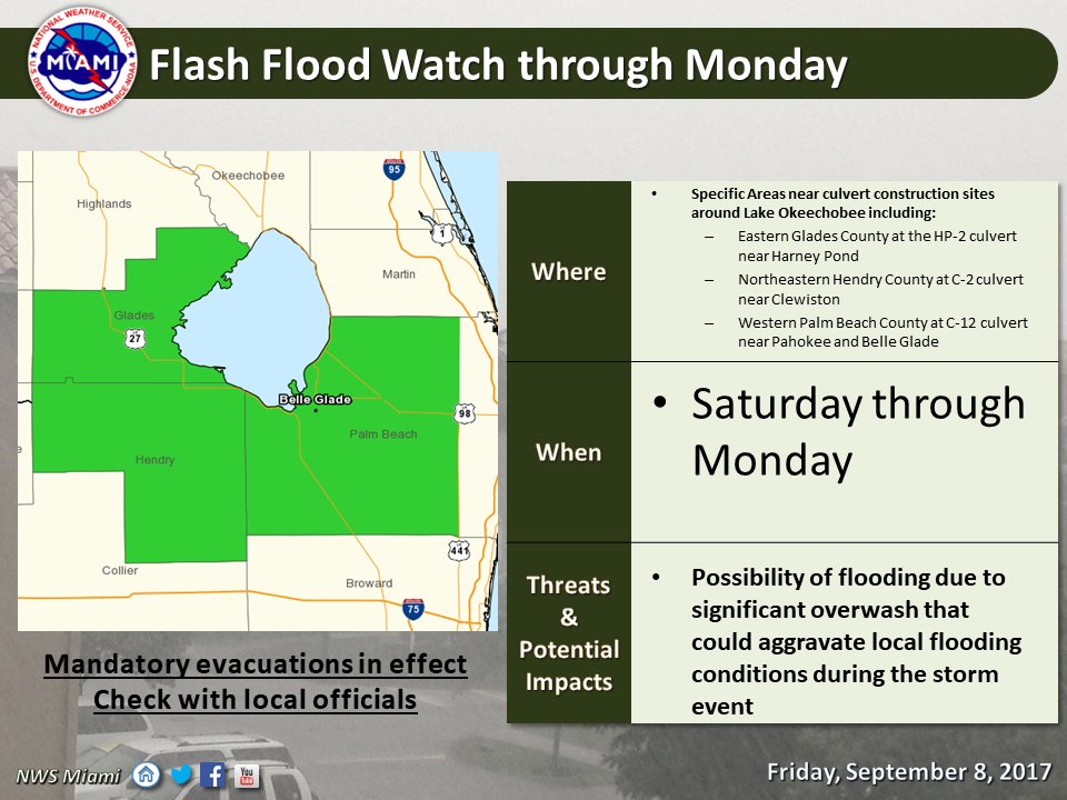 2pm Friday: FLASH FLOOD WATCH for areas near Lake Okeechobee. Mandatory evacuations are in effect! #FLwx