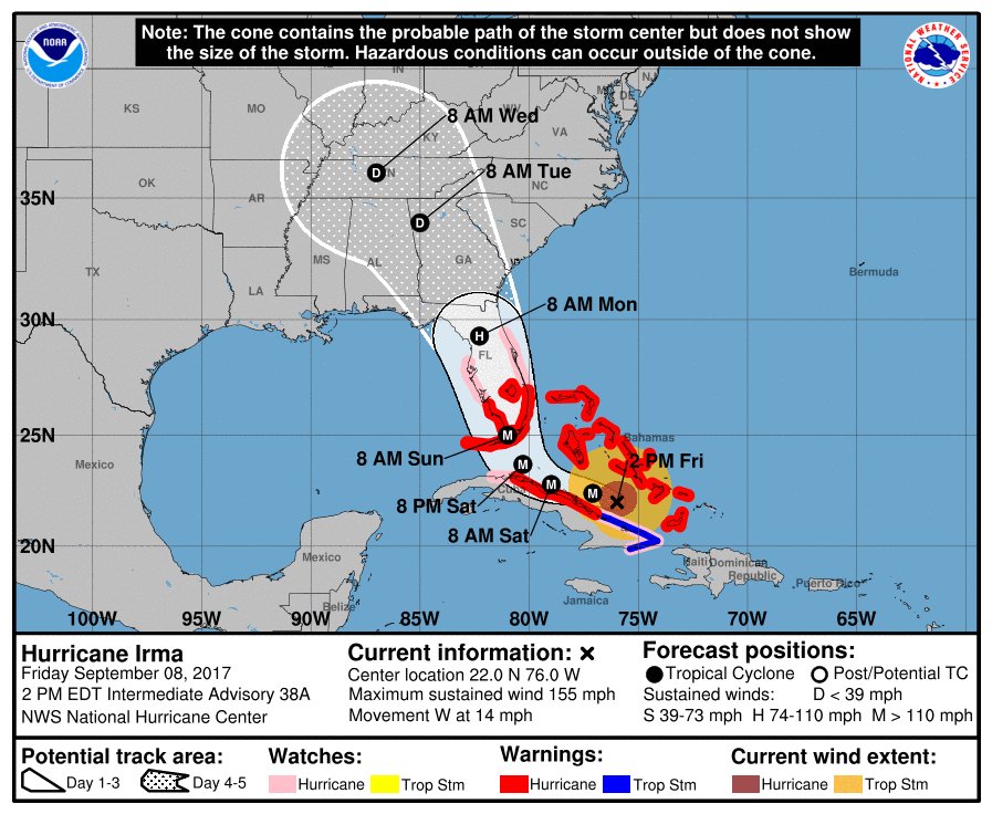 Now a Cat 4 hurricane, #Irma will reach Florida on Sunday, with impacts extending to GA/SC. http://bit.ly/2wes6vr