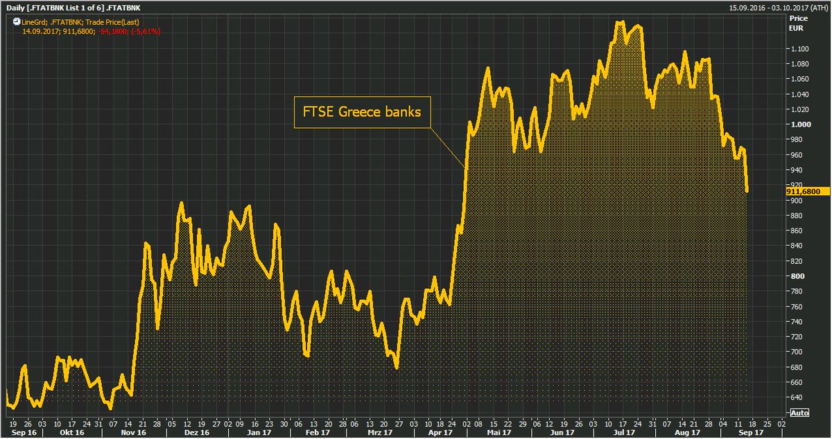 #Greece's banking index drops almost 6% despite Greek bank reliance on ELA falls to €30.8bn in August.