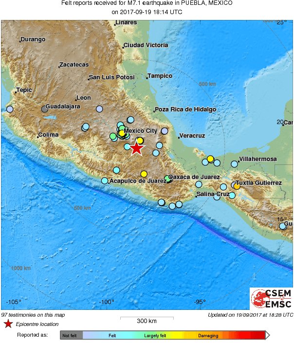 M7.1 #earthquake (#sismo) strikes 115 km SE of Mexico City (#Mexico) 15 min ago. Effects reported by witnesses: