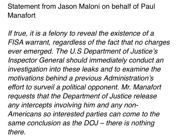 Manafort not taking leak of alleged wiretaps lightly. Calls for investigation and release of information.