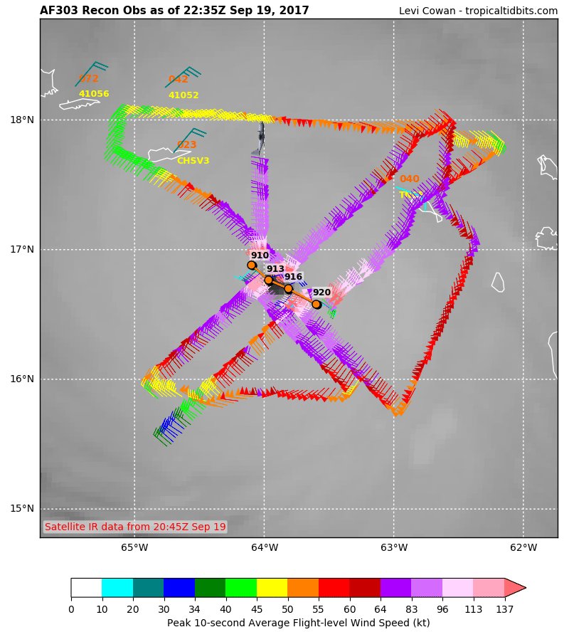 Wow. Hurricane Maria now down to 910mb, with evidence of 150kt (170mph, 280kph) winds.