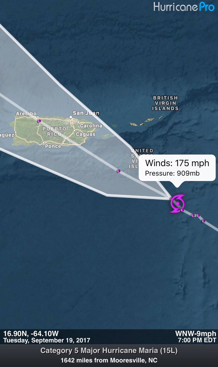 Hurricane #Maria with wind speeds sustained at 175 miles per hour. Going to track right over Puerto Rico. Pray for those folks!