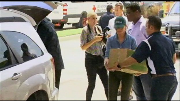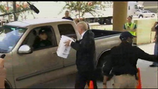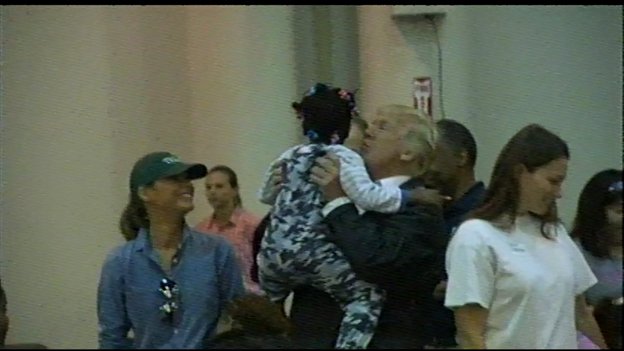 Outside the church, Pres and Mrs Trump help distribute cases of water and other supplies to storm victims.