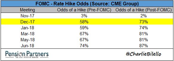 Odds of a December rate hike move up from 58% to 73% after the FOMC meeting. A month ago they were at 34%.