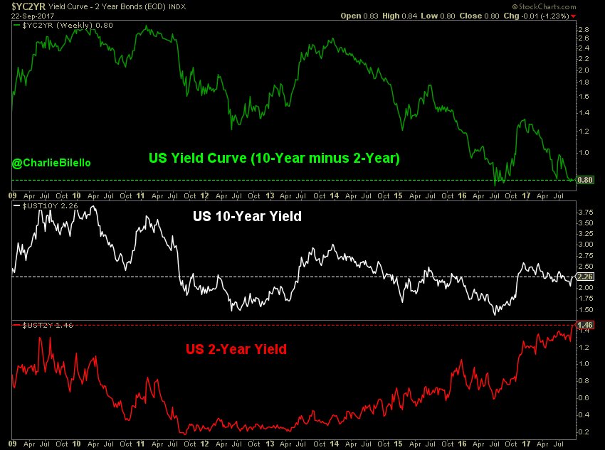 US Yield curve ends the week near its flattest level of the expansion: 80 bps spread b/t 10-yr & 2-yr yields.
