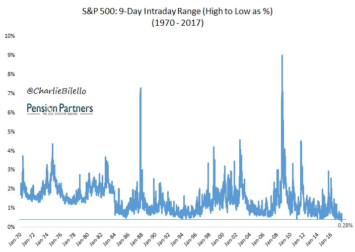 The last 9 trading days have been the most peaceful days in the history of markets. 0.28% avg intraday range. $SPX