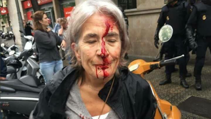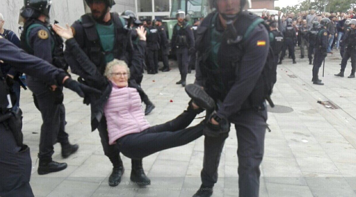 Spanish riot police preventing elderly Catalan woman from voting for independence. #CatalanReferendum