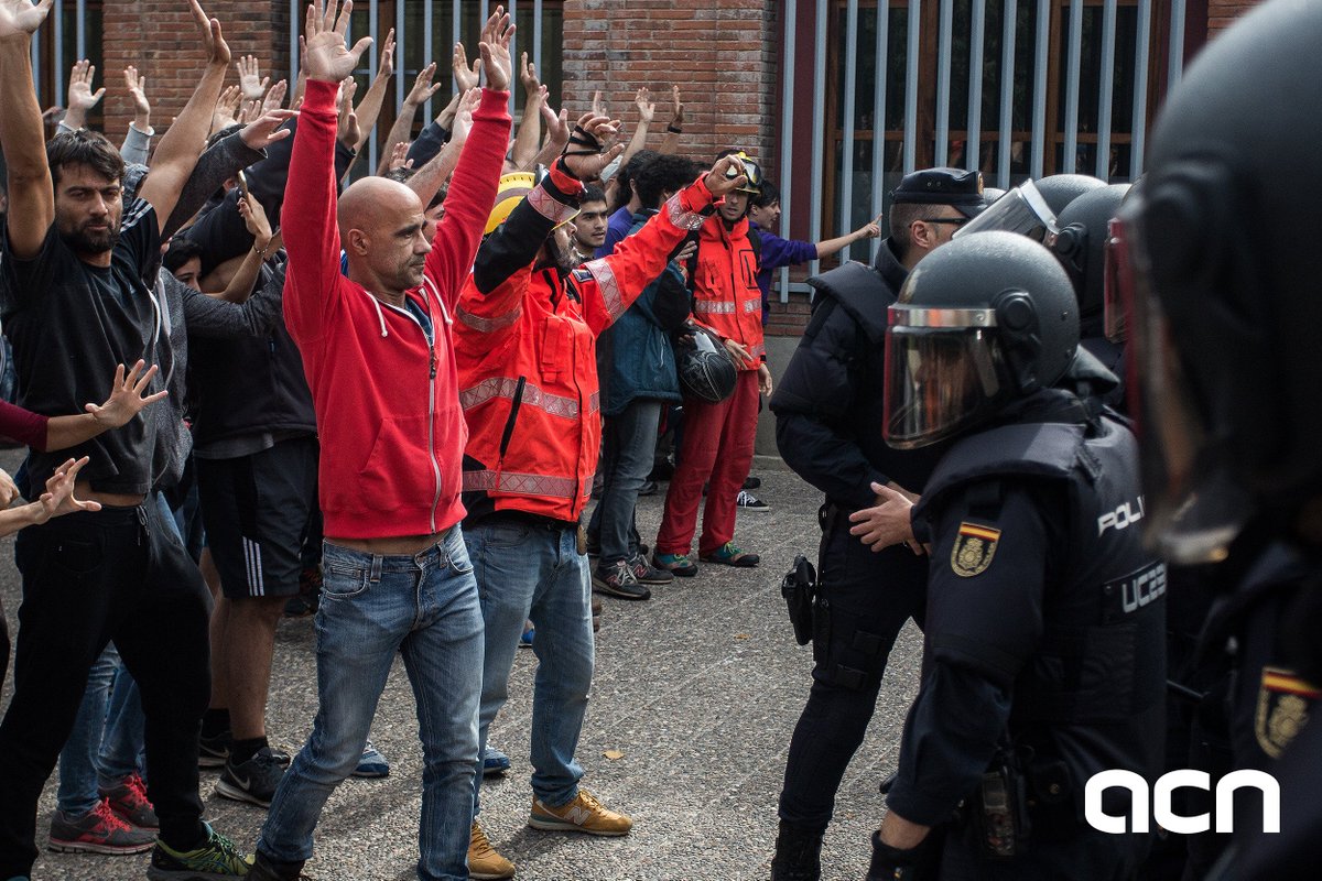 People with their arms raised in front of Spanish riot police, including Catalan firefighters #CatalanReferendum