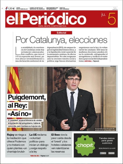 El Periódico: "Puigdemont tells King: 'Not like that'" + Editorial: "For Catalonia, elections".