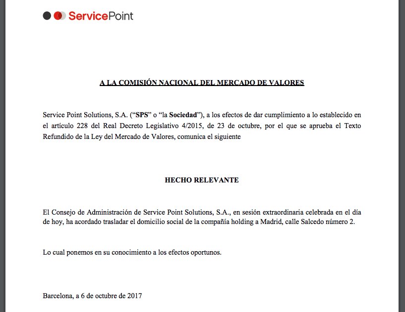 BREAKING: Service Point Solutions confirms to Spanish stock regulator CNMV it has changed its corporate address from Barcelona to Madrid.