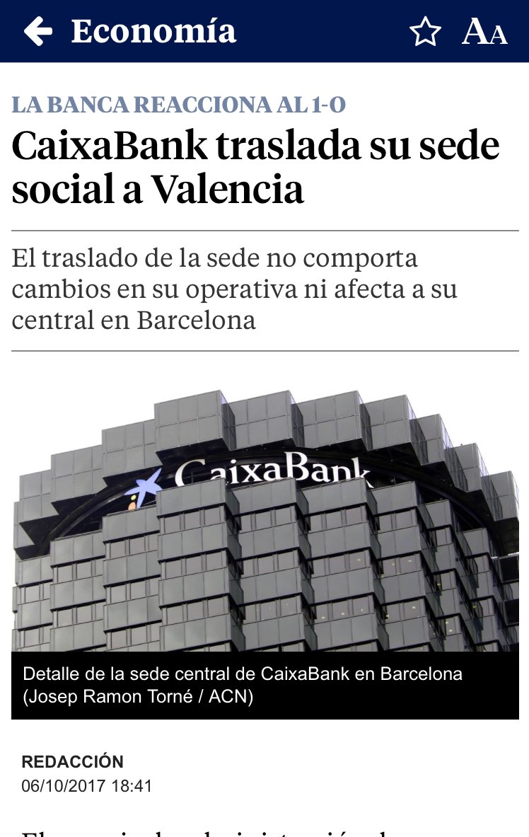 MAJOR BREAKING: CaixaBank, Spain's third largest bank, moves coporate address from Catalonia to Valencia. (La Vanguardia)