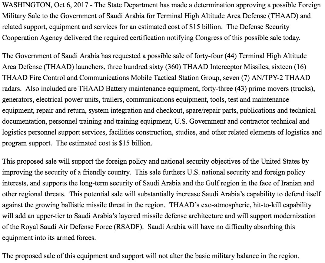 Hoo boy. State Dep't gives its nod to $15B (!) THAAD sale to #SaudiArabia. 44 (!) THAAD launchers & 360 interceptors in possible package.
