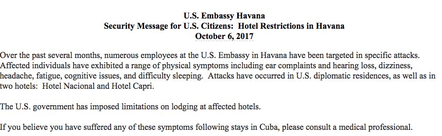 NEW: US Embassy in Havana issues hotel restrictions to citizens after some report suffering from symptoms of hearing loss & cognitive issues
