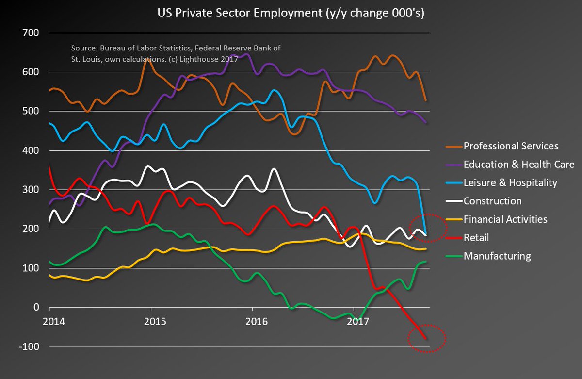 #NFP round-up: private sector y/y change: #retail and #leisure & #hospitality #employment trends don't look too hot