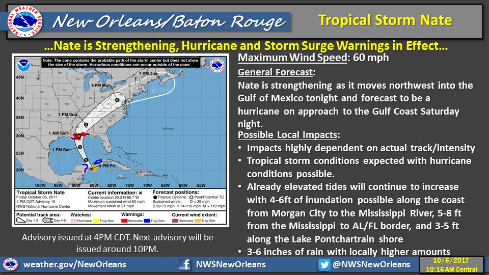Here are the key messages for Tropical Storm #Nate as of 4:00pm CDT. A Hurricane Warning has been issued for metropolitan New Orleans.